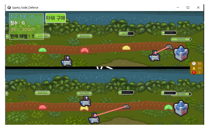 우리가 만든 게임은 위 그림처럼 2명의 유저가 방에 들어가서 오른쪽에 있는 성이 먼저 파괴되는 유저가 패배하는 게임이다. 개인 프로젝트와는 다르게 500명을 접속해 패킷을 전송해도 지연되는 상황은 딱히 발견되지 않았다.
