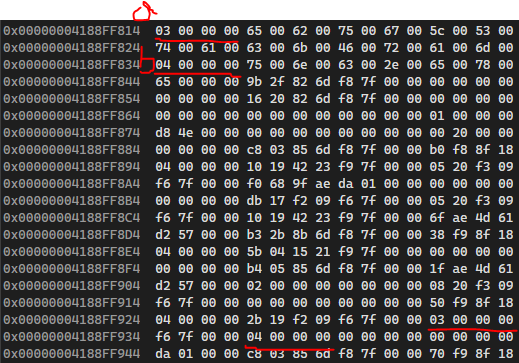위 구조는 32비트 환경에서 빌드한 것인데, 64비트 환경에서 빌드하면 전혀 다른 스택 프레임이 나타난다.