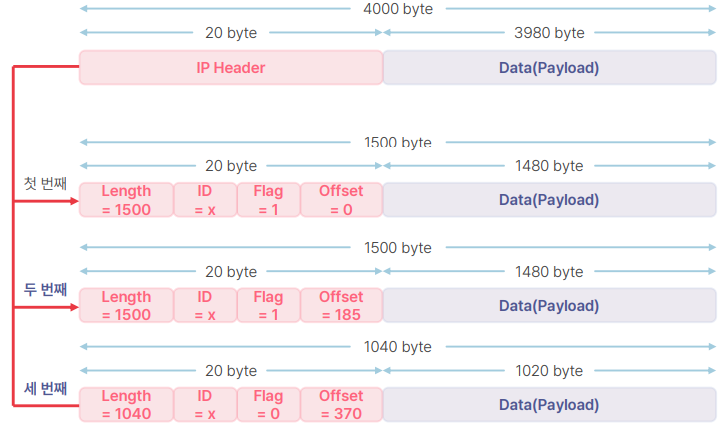 - MTU가 1500 Byte 이며, 4000 byte의 데이터를 보낼 때 IP Header