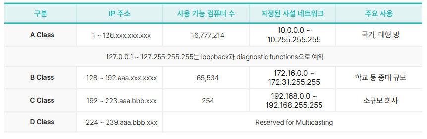 - IP 클래스에 대해서는 '과거에 이런 기준을 통해 IP를 분류하였구나' 정도로 생각하고 넘어가면 된다.