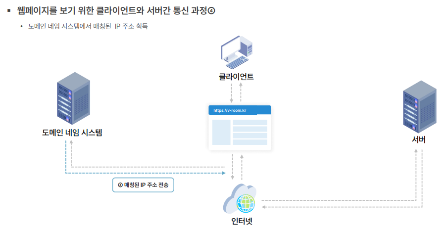 예를 들어 클라이언트가 v-room.kr에 접속을 한다고 하면, v-room.kr의 주소를 도메인 네임 시스템에 물어보게 되고, 도메인 네임 시스템에 등록된 주소라면 매칭되어 있는 IP 주소를 알려주게 된다. 이를 받은 클라이언트가 해당 IP 주소에 다시 통신을 요청하게 되는 것