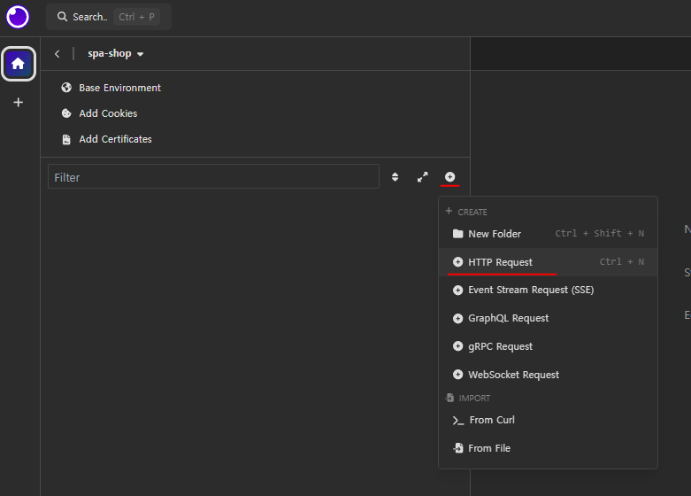 3. + 버튼을 눌러 테스트 하려는 HTTP Request를 생성한다.