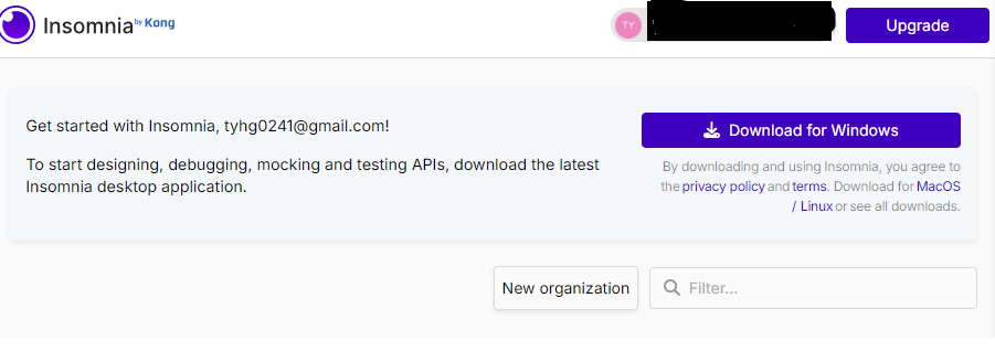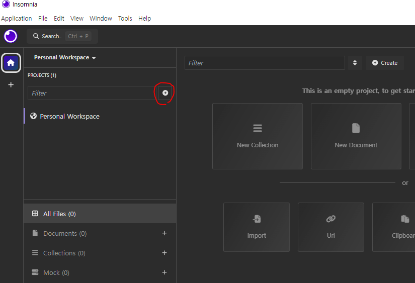 1. Insomnia API Client를 실행하고,+ 버튼을 눌러 새로운 프로젝트를 생성한다.