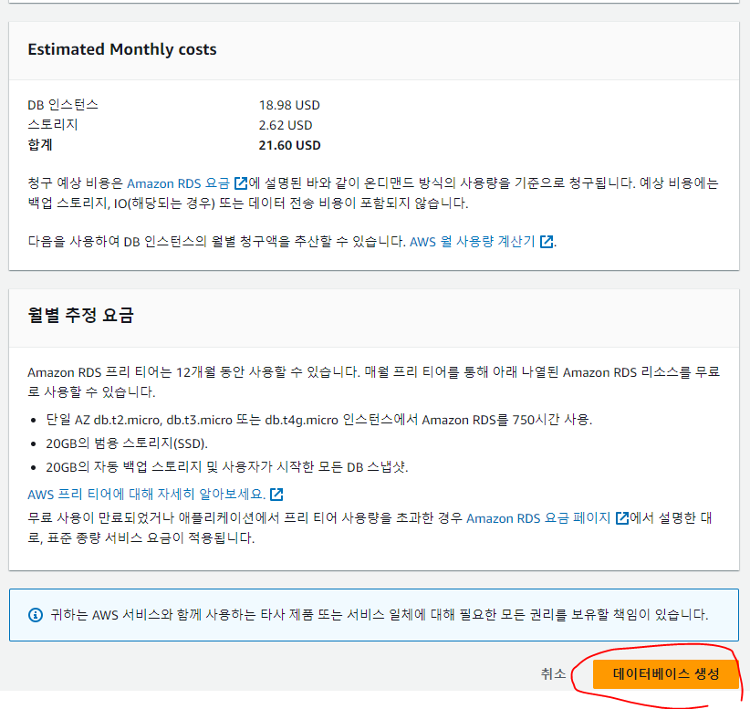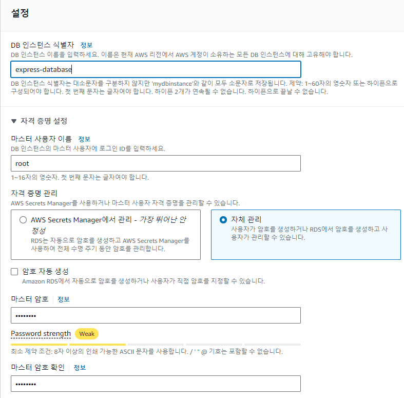 - DB 인스턴스 식별자, 마스터 사용자 이름, 암호, 암호 확인