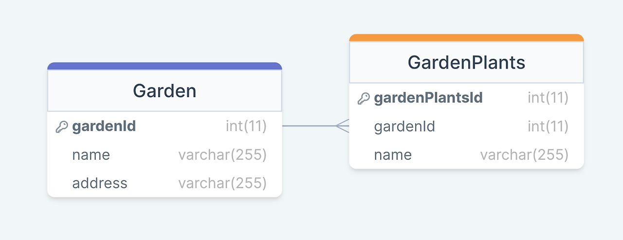 위 예제에서 gardenId는 정원 식물 ( GardenPlants ) 테이블에서 정원 ( Garden ) 테이블을 참조하는 외래키다.