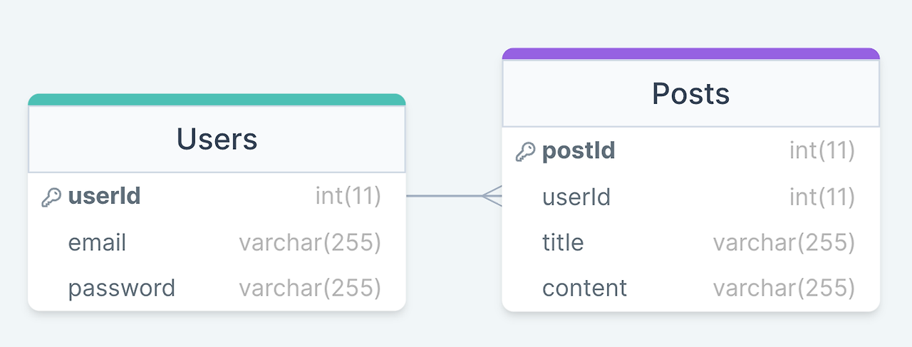 위와 같은 ERD는 사용자 ( Users ) 테이블과 게시글 ( Posts ) 테이블에서 1명의 사용자가 여러개의 게시글을 작성 할 수 있으므로 1:N 관계를 갖게 된다.