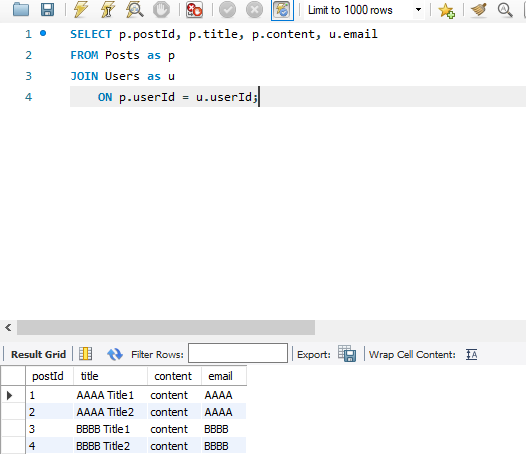 SELECT p.postId, p.title, p.content, u.email