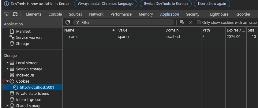 - /set-session API가 호출되면 name=sparta의 정보를 세션에 삽입하고, 해당하는 데이터를 검색하기 위한 시간 정보를 쿠키로 반환한다.