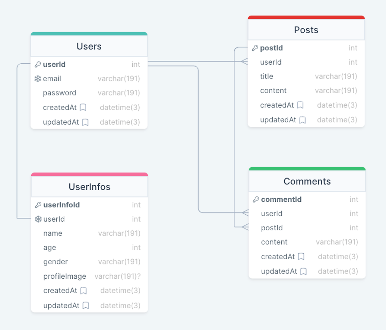 - Users 테이블과 Posts 테이블을 1:N 관계를 가지고 있다.