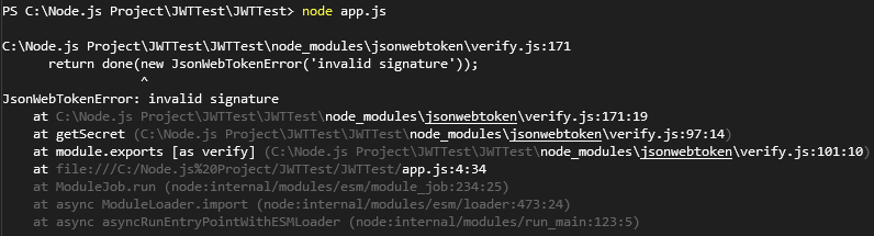 - mysecretkey를 secretkey로 변경해서 실행해보자 ( 그러면 아래와 같은 에러가 발생하게되어, 검증에 실패했다는 것을 확인할 수 있다. )