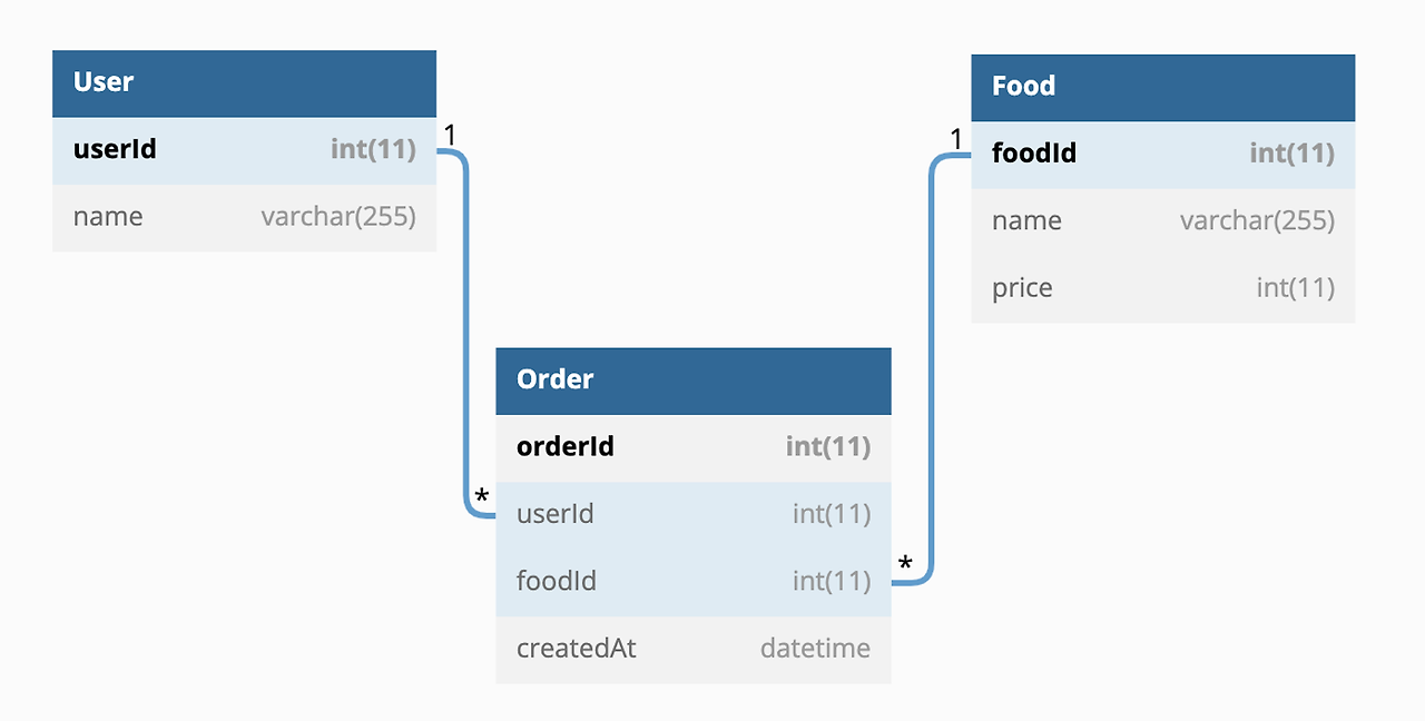 1:N - 1명의 사용자 ( User )는 여러개의 주문 ( Order )을 할 수 있다.