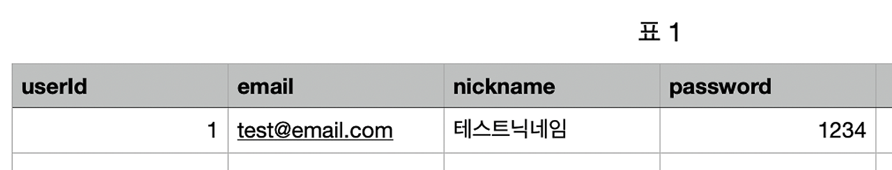 행은 test@email.com, 테스트닉네임, 1234와 같은 정보를 나타내고,