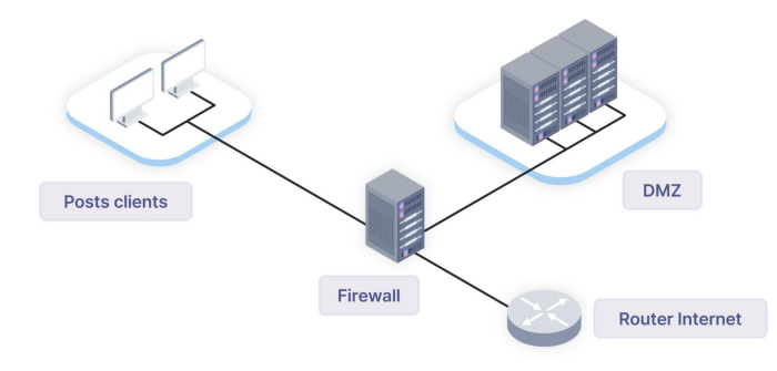 위 그림처럼 네트워크를 구성하게 되면, 외부에서 DMZ로의 접근은 가능하나, 방화벽으로 인해 내부망 Posts clients로는 접근이 불가능하게 된다.