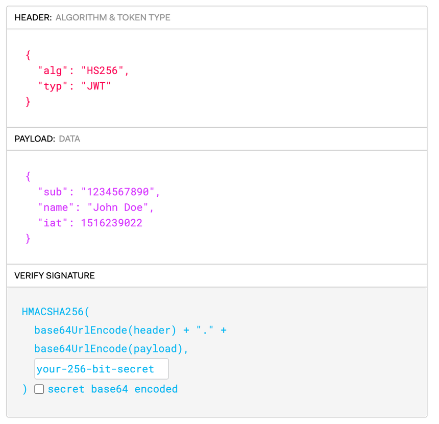 - Signature : 서명은 헤더와 페이로드, 그리고 비밀 키 ( Secret Key )를 이용해 생성된다. 이 서명은 토큰이 변조되지 않은 정상적인 토큰인지 확인할 수 있게 도와준다.